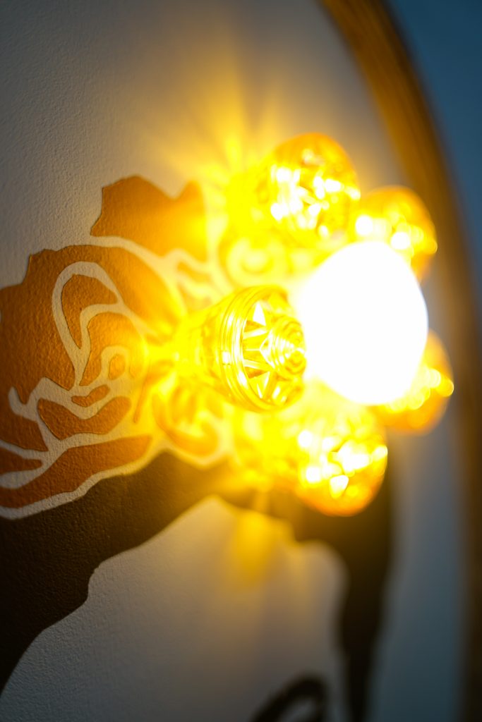 When I design a artwork, I spend a lot of time designing the pieces so they look equally amazing when they are switched on and off, I also use the most modern super low energy L.E.D lamps at just over 1w of power each, to put that into perspective the average kettle is 2300w